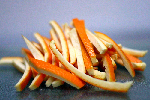 Using a medium size pot, place the peels in boiling water and blanch them for a few minutes. Rinse the peels, and repeat this process a second time. This is done to remove the bitterness of the peels.