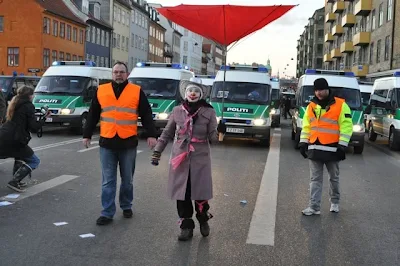 This was not as it was portrayed in the press, with 900 arrests and cordons of police with batons and gas grenades; this was a line of happy people, in a celebratory mood, that stretched six kilometers from city center to COP-15. At the back of the line, separating the demonstrators from the police, were three rodeo clowns, putting their own bodies between the bulls and the bullriders, whistling and ushering away protesters from potential harmful contact.