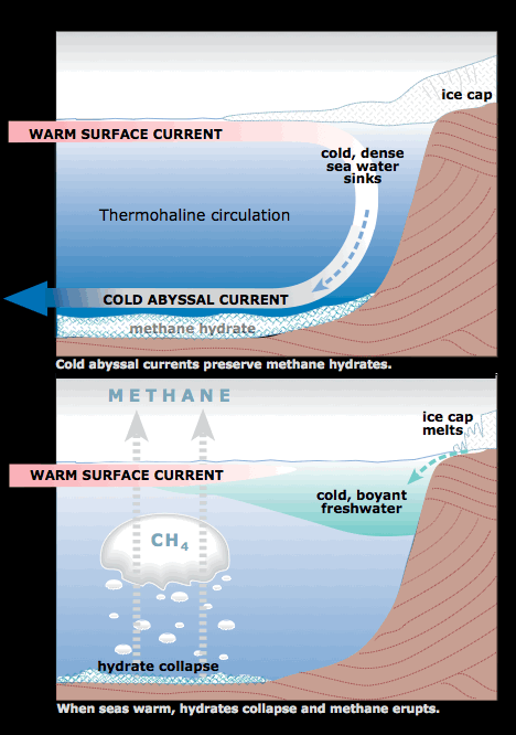 The last IPCC assessment (AR4) concluded that the risk of a melting clathrate event triggering a sudden shift to a much warmer planet is minimal. A sustained increase in sea temperature will warm its way through the sediment eventually, and cause even the deepest, most marginal clathrates to start to break down, but it will typically take of the order of a thousand years or more for the temperature signal to get through.One exception, however, may be in clathrates associated with the Arctic Ocean, where water is shallower and clathrate ice crystals are stabilized by lower temperatures rather than higher pressures. Recent research carried out in 2008 in the Siberian Arctic has shown millions of tons of methane being released, apparently through perforations in the seabed permafrost.
